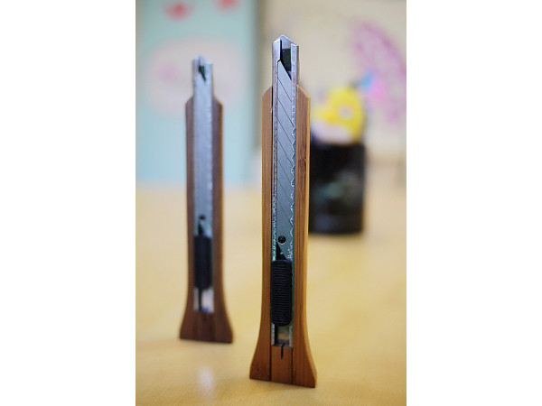 這組美工刀還有可愛的名字,刀柄由竹子做成的稱作火竹前刀,另一隻由胡桃木打造的則稱為飛木幾刀;也因為獨特材質,在刀柄最後面的設計特地加裝了磁鐵固定刀片。
