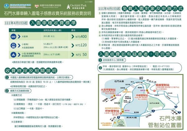 為積極提升石門水庫服務品質,北區水資源局與桃園市政府攜手合作推動「石門水庫及大漢溪跨域亮點計畫」,石門水庫自下(4)月起,將改採新制入園措施。為使新建置電子感應收費系統啟用順利,北水局於3月26日起至4月8日,進行系統測試,此期間遊客入園將免收費用,歡迎大家利用清明連假到水庫一遊。