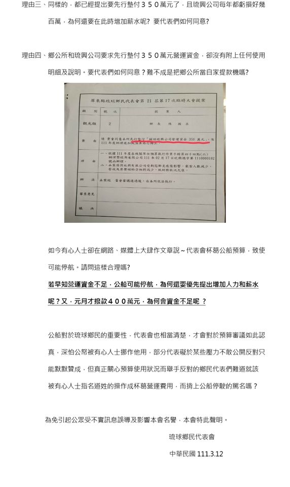 琉球鄉民代表會對此也發出聲明稿,回應:為什麼「代表會」沒有同意墊付琉興公司(公船)350萬元?