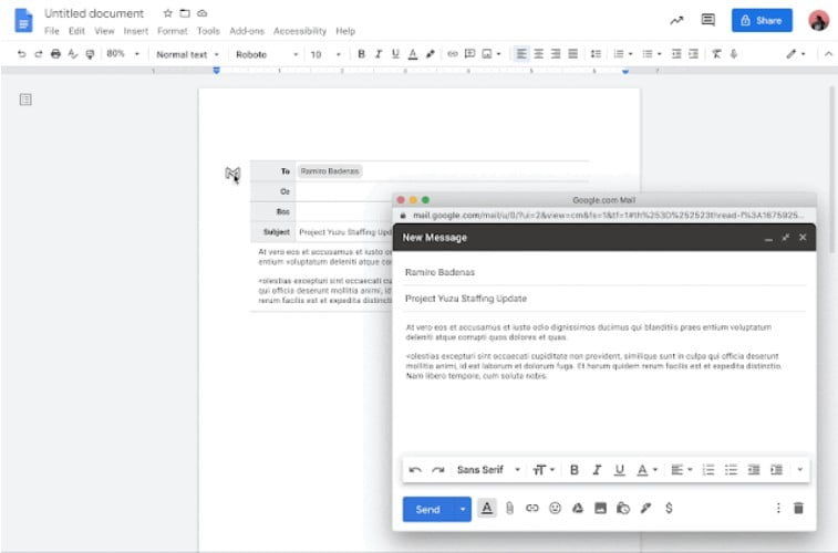 Google宣佈文件「GoogleDocs」中推出一項新功能,透過人工智慧判斷,將文件編輯與Gmail結合,編輯文件的同時,就可以同時撰寫Gmail,不須將內容複製到Gmail中,就可以直接傳送。