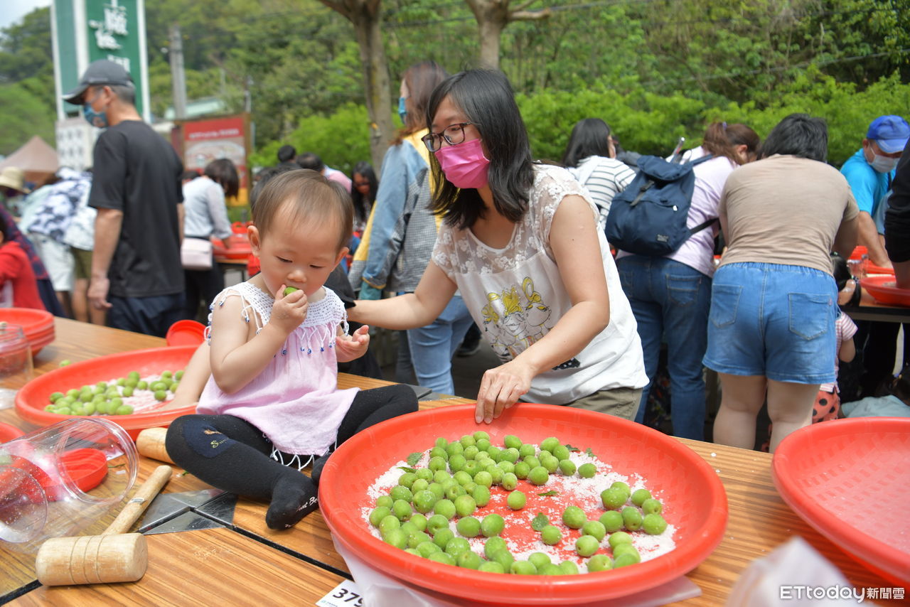 ▲500人齊聚信義鄉農會體驗製梅DIY,小小孩迫不及待拿著還沒完成的青梅吃(下同)。(圖/南投縣政府提供)