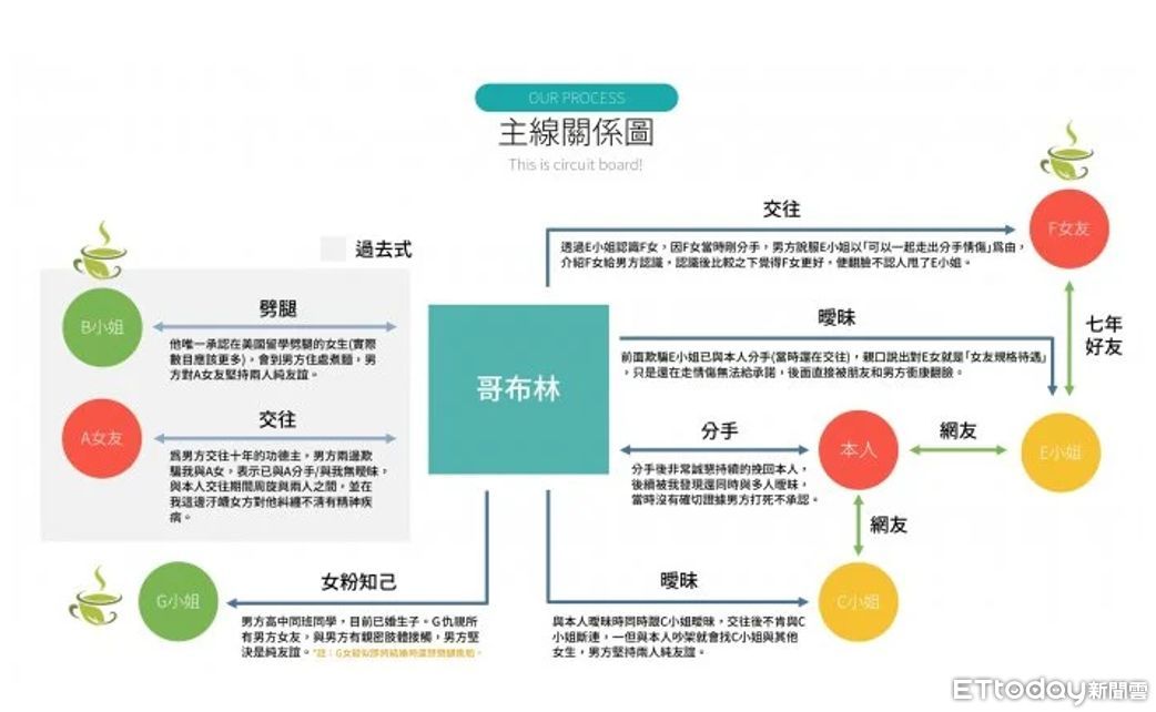 而另一個「關係圖」更是錯綜複雜,包括男方與原po曖昧時,也放線C小姐,甚至在兩人交往後,仍不願與對方斷聯,只要和原po一吵架就去找C或其他女生。