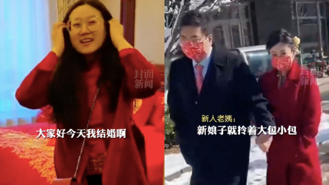 畫面顯示,在下完雪後的街上,兩位新人戴著同款紅色口罩,新娘一身紅緊緊牽著新郎的手,幸福洋溢。據新人的家屬透露,排隊的民眾看到這對新人後,紛紛讓路給他們。