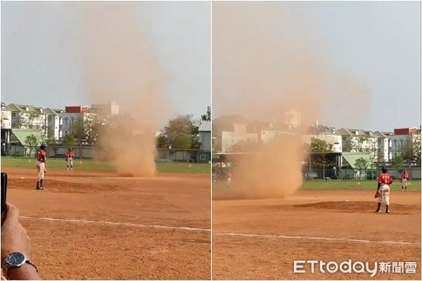 龍捲風的出現,也讓主審在第一時間暫停比賽,選手與教練看了也忍不住不斷驚呼,「老師龍捲風欸!」、「欸他上二壘了」、「他來掃地的啦」,不過約1分鐘過後龍捲風即散去。