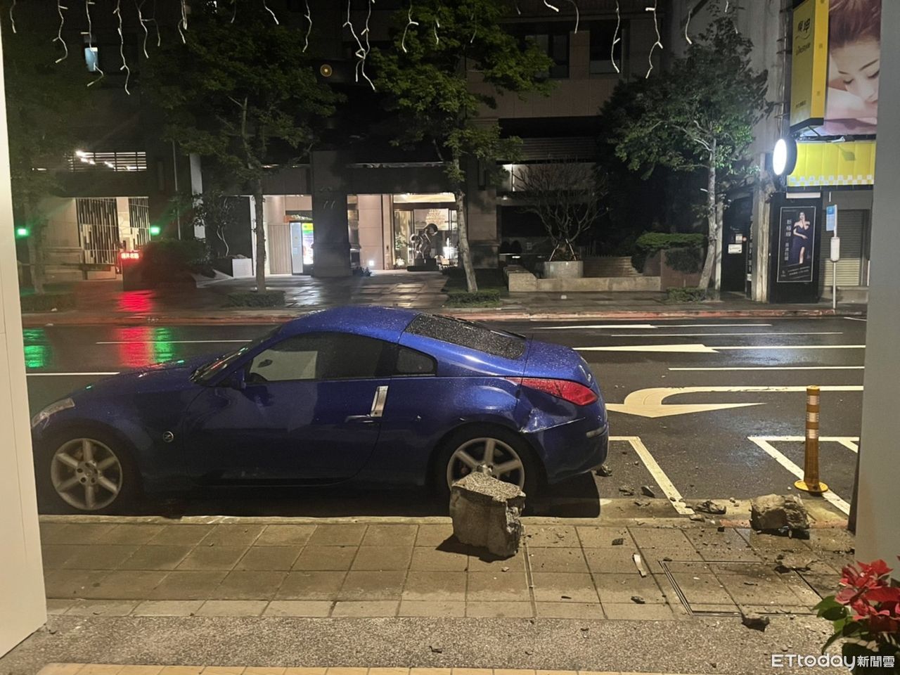 ▲21日凌晨中正區博愛路一輛停放路旁的日產350Z跑車遭外牆剝落水泥塊砸毀後葉子板、所幸並無人員受傷。(圖/記者張君豪翻攝)