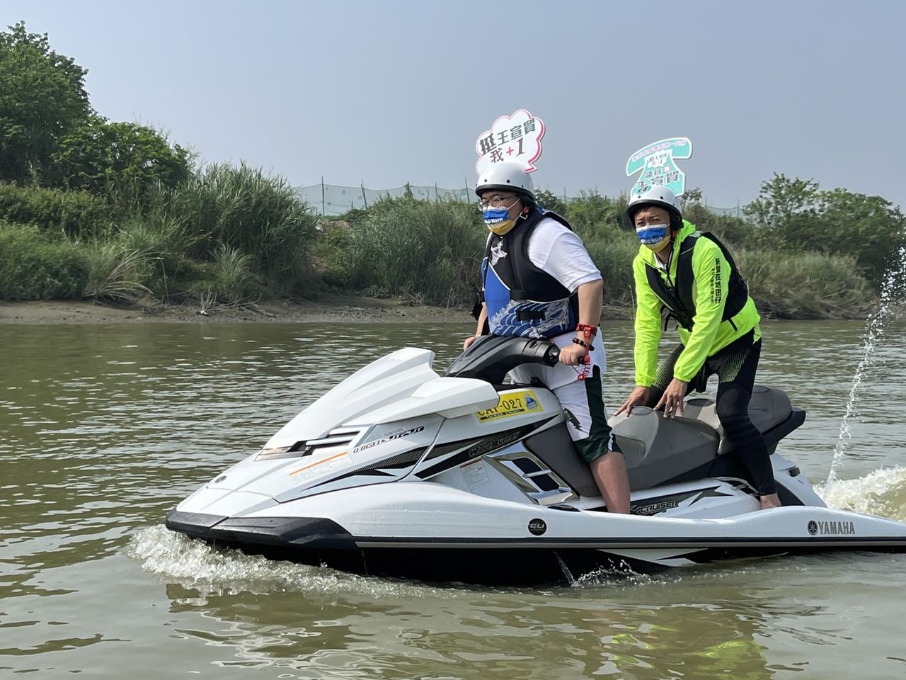 ▲民進黨立委蔡易餘騎水上摩托車載王宣貿從嘉義布袋直達台南鹽水。(圖/蔡易餘辦公室提供,下同)