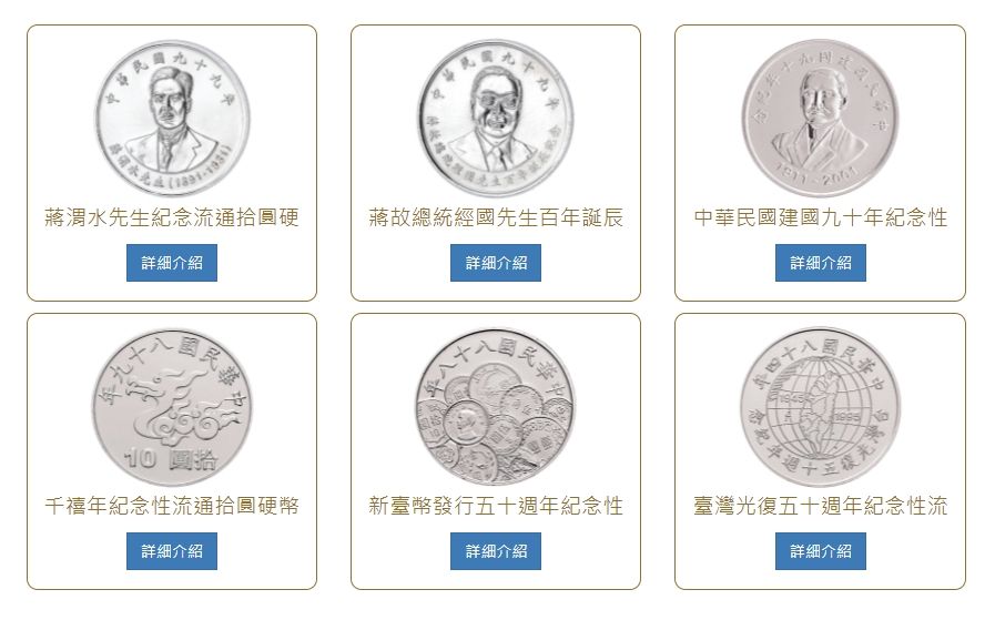 ▲中央造幣廠網頁目前共列出6款紀念性流通拾圓硬幣。(圖/翻攝自中央造幣廠網頁)