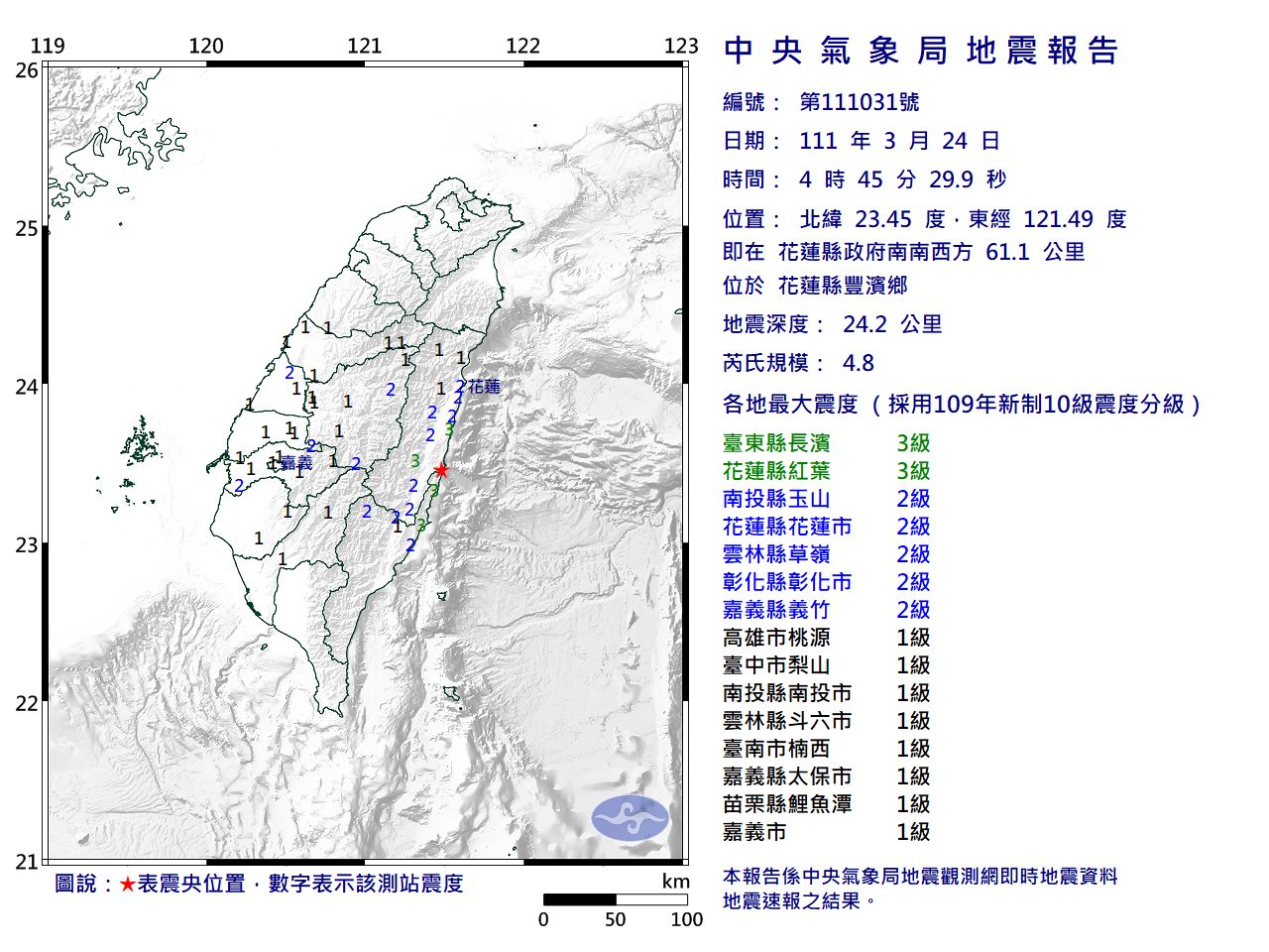 發震時間:111年03月24日04時45分29秒