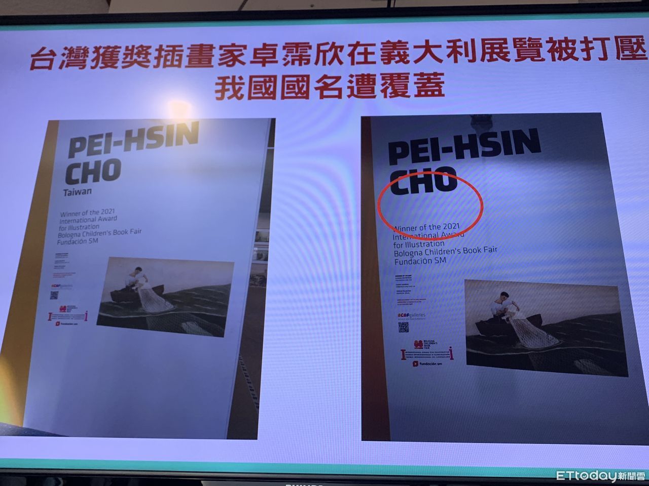 不過今(24)日立委黃國書提到,我國一位插畫家卓霈欣,獲得了波隆那SM基金會國際插畫家大獎,可說是台灣之光,不過昨日聽聞在義大利波隆那書展會場上,發現卓霈欣的「Taiwan」國號國名被塗銷了,據了解是中國大陸在義大利的外交單位,去向波隆那市的省政府省長抗議,表示要用TAIWAN CHINA,而波隆那市也感到無奈,他們了解台灣和中國的政治問題,也不想這麼做,只好想出折衷方案,將國名全部塗銷,變成沒有TAIWAN,也沒有TAIWAN CHINA。