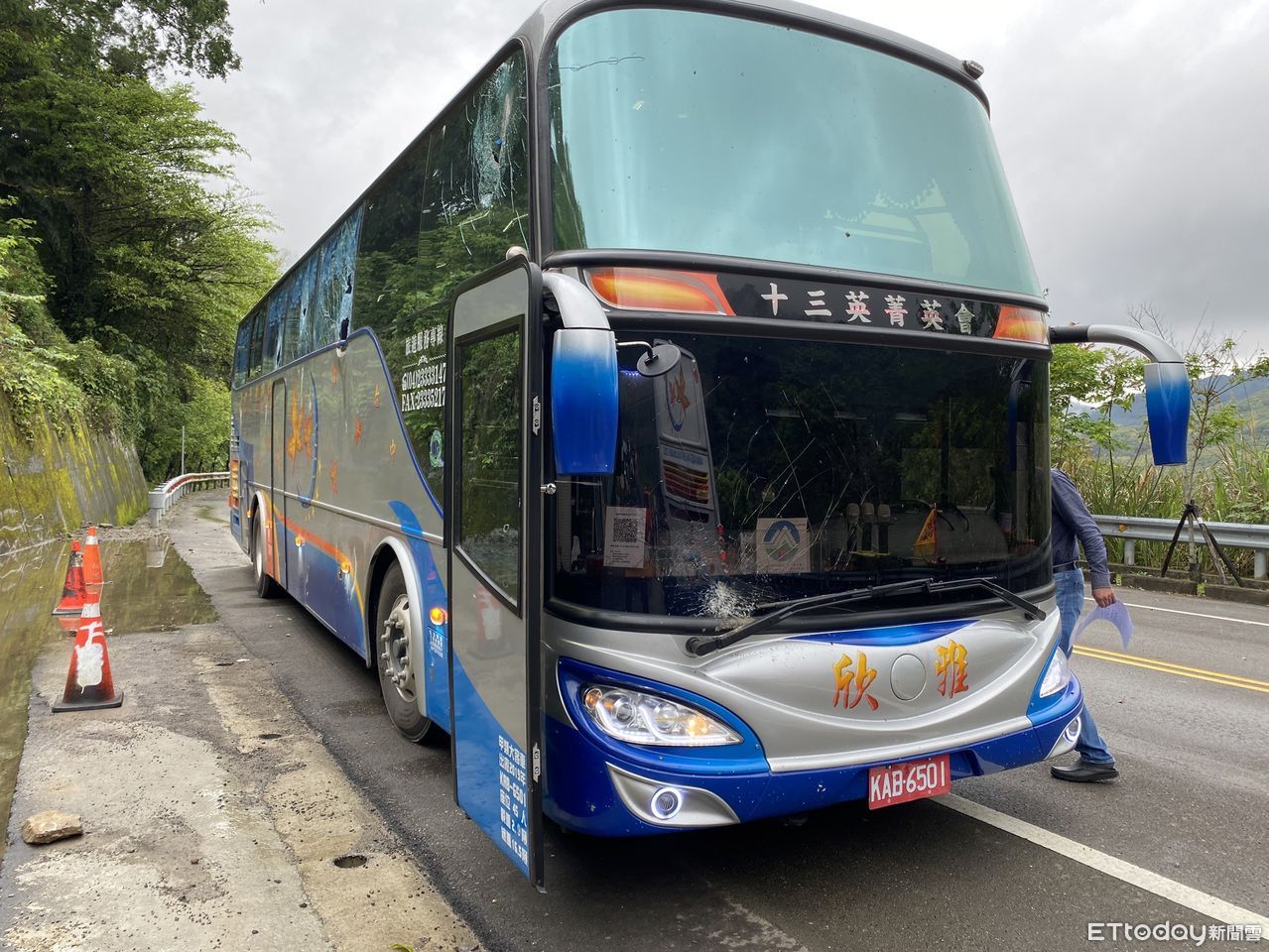 ▲▼苗栗縣泰安鄉落石頻傳,1輛台中來的遊覽車,被落石擊中,一名婦人遭玻璃割傷送醫。(圖/記者黃孟珍翻攝)