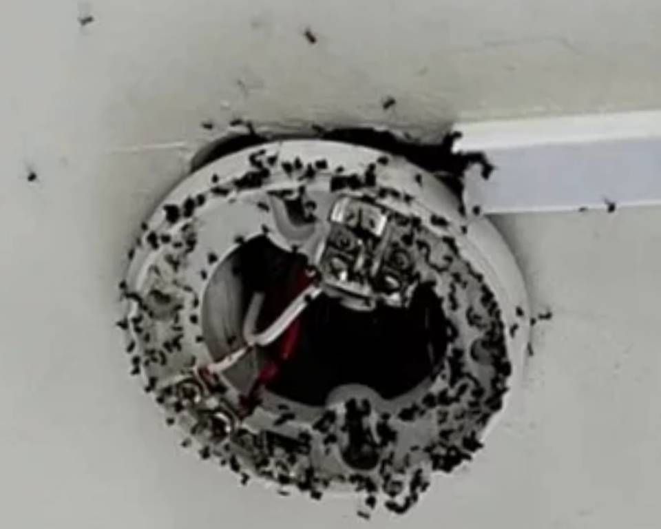 嚇人!南投縣埔里鎮愛蘭國小活動中心22日清晨4時許火災警報器狂響,驚動周邊居民,響了1個多小時就是找不到火源,消防人員清查後發現密密麻麻的「黑色大軍」琉璃蟻在管線內築巢,咬破了警報器所致,校方表示,目前已經也清除,未來會加強防治工作。