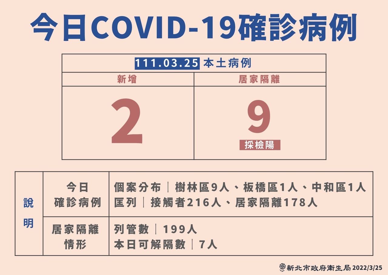 衛生局說明,案22556為男性,20多歲,已接種2劑疫苗,越南籍,為樹林科技廠夜班人員,3/23出現發燒症狀,3/24就醫採檢PCR陽性,Ct值19.35,收治隔離治療。