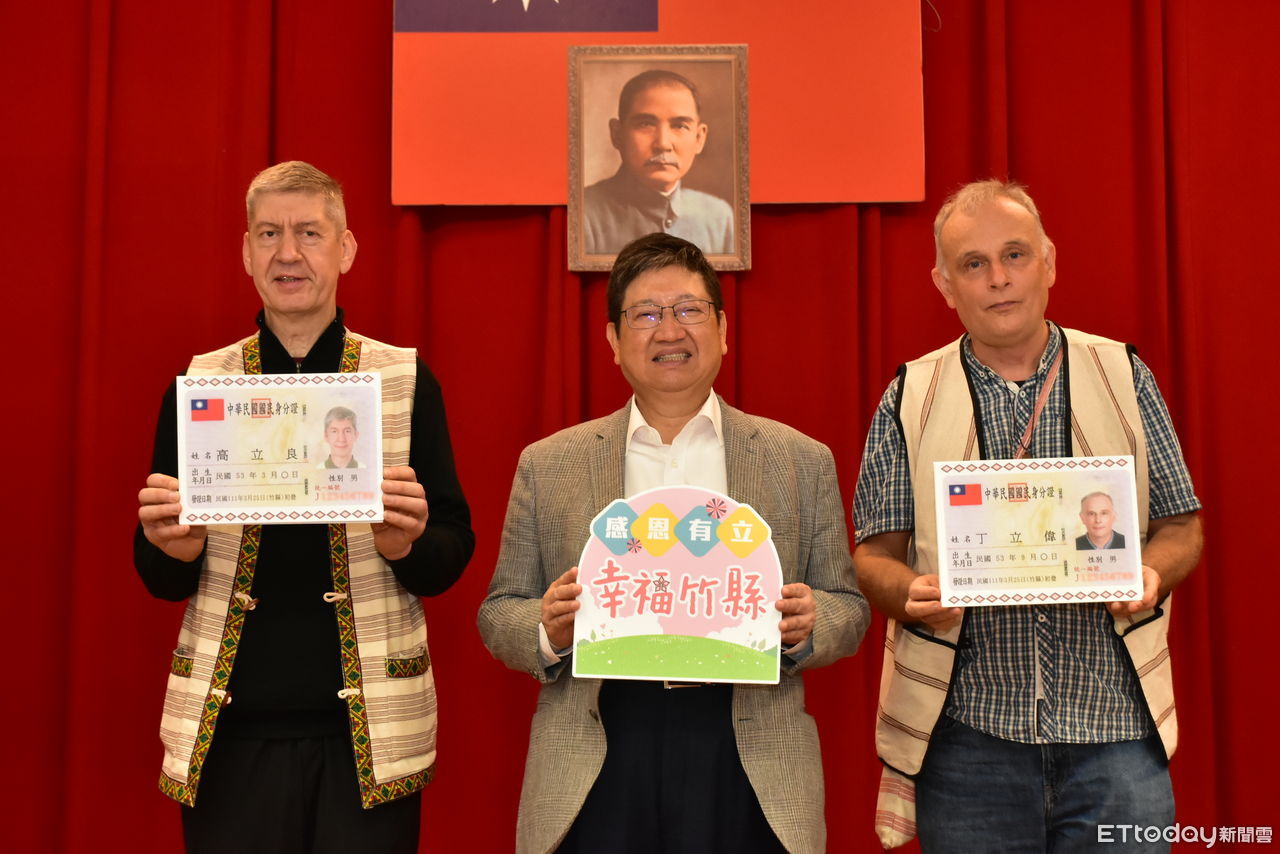 ▲丁立偉、高立良神父今年2人以殊勳歸化方式取得我國身分證,成為臺灣人,新竹縣長楊文科今日前往尖石鄉頒發2人身分證。