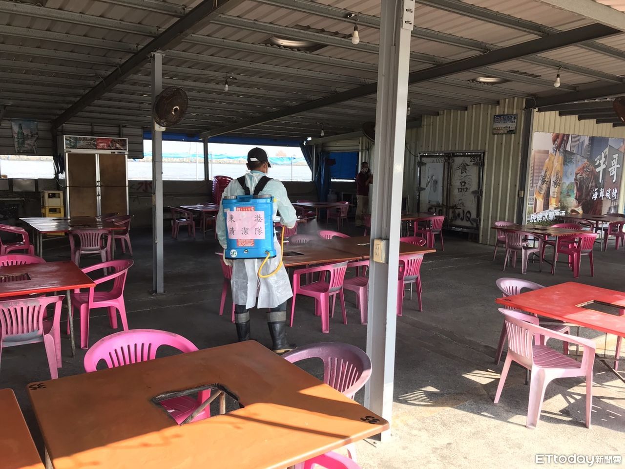 ▲東港鎮牛哥海鮮炭烤清消作業 。(圖/記者陳崑福翻攝,下同)