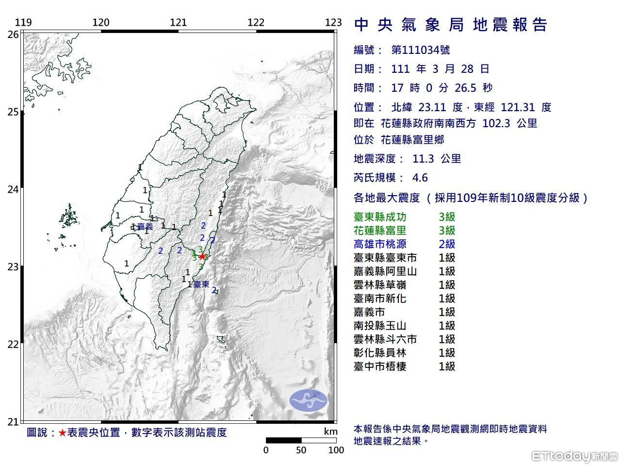 發震時間:111年03月28日17時00分26秒