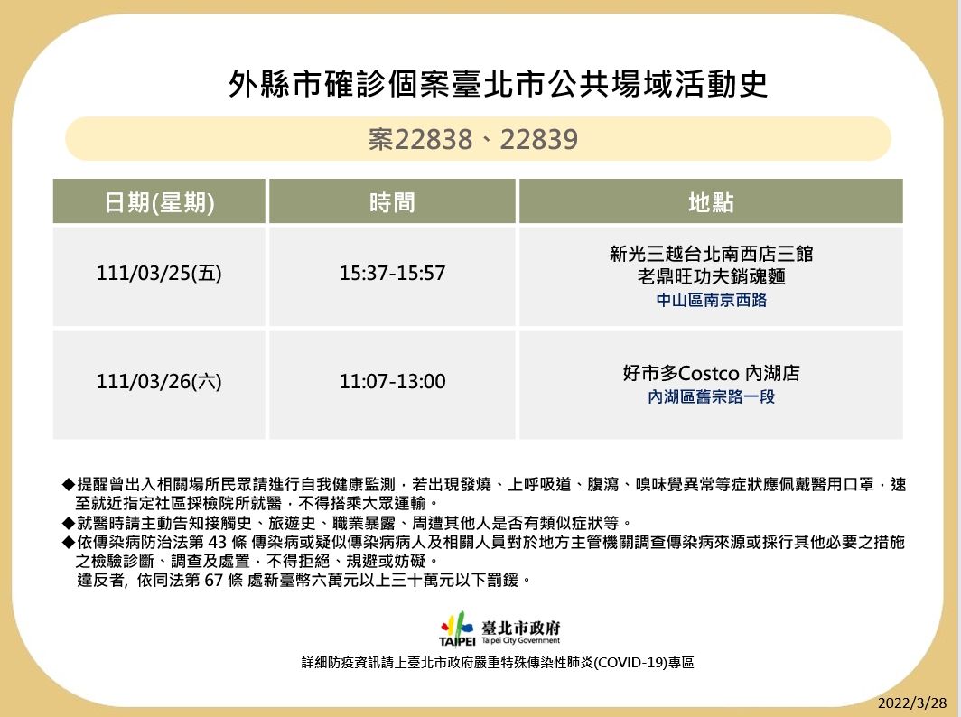 新冠肺炎本土疫情升溫,新北市三重女業務(案22701)日前染疫,延伸出友人、同事確診案。台北市衛生局28日晚間公布電話行銷公司同事(案22838、案22839)足跡,包括曾在3月25日到新光三越台北南西店三館的老鼎旺功夫銷魂麵,3月26日至好市多Costco內湖店。