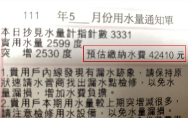 原PO在臉書「爆系知識家」的文章中提到,家中的水費以往都是2個月700元至1000元,這次卻突然被通知5月的水費可能高達4萬2410元,她趕忙打電話詢問自來水公司,對方表示水表沒有壞,請她自己去外面找人維修,「請問有人遇過嗎?維修要多少費用?那水費呢?謝謝各位。」