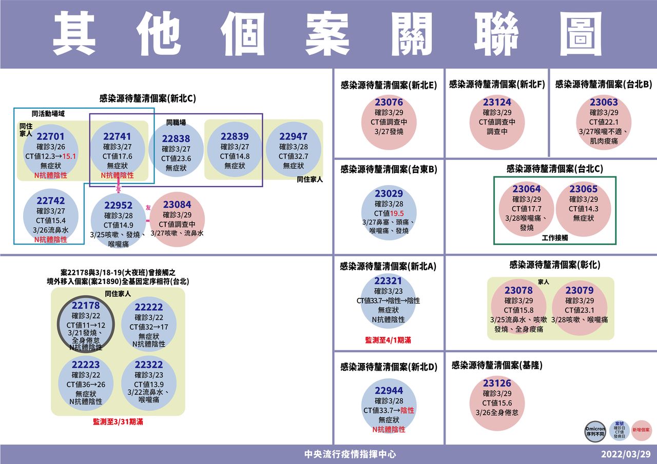 另有2例分部在新北,案23076為新北永和家管,3/27發燒就醫採檢確診;案23124為淡水區50多歲男性,3/26咳嗽發燒流鼻水,3/28採檢陽性確診。基隆也有1例個案,為安樂區50多歲男性,3/26因全身倦怠,3/28採檢確診,Ct值15.6。