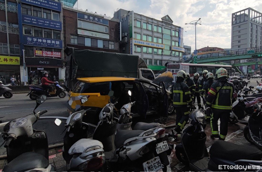▲計程車在馬路上燒起來,消防立刻灌水線撲滅火勢。(圖/記者黃宥寧翻攝)