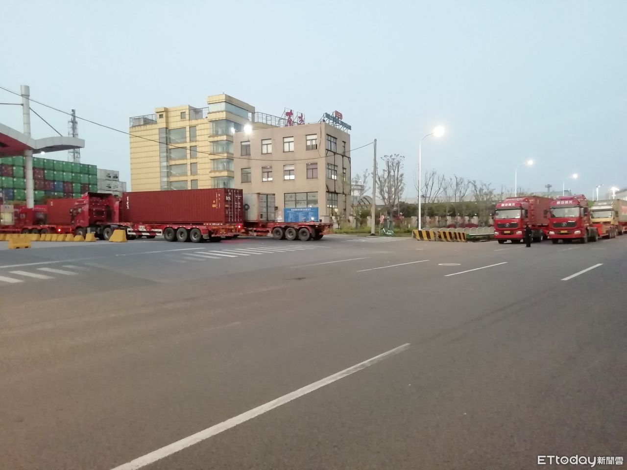 ▲▼仍在維持營運的貨櫃堆場附近道路,貨櫃車輛日夜大排長龍。(圖/記者趙禕攝)