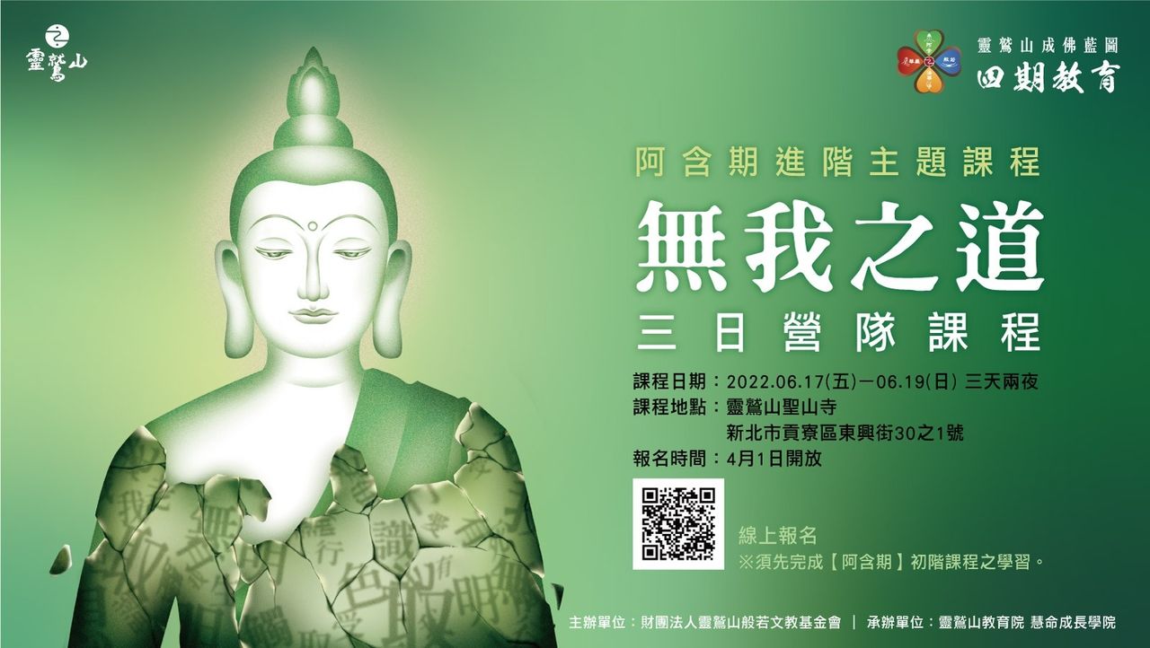 靈鷲山教育院2022年全台首度開辦「四期教育」阿含期進階《無我之道》營隊課程,將於6/17〜6/19在靈鷲山聖山寺進行三天兩夜的密集學習體驗,提供予四期教育-阿含期初階《初轉之法》學員進階學習課程,這也是今年唯一的一場《無我之道》營隊課程,除了多位專業的授課法師團隊,搭配特別設計的體驗活動與師生互動教學,一點一滴在動靜之間匯聚佛法智慧,讓學員短時間內獲得最豐盛的佛法資糧。