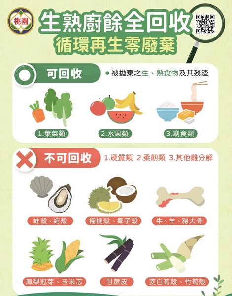 桃園環保局為進行垃圾源頭減量,減輕垃圾處理壓力,推行「生熟廚餘全回收」政策。經過3個月的宣導期後,1日起正式實施。環保局強調,若經破袋檢查發現未依規定回收,將依違反廢清法規定處1,200元以上6,000元以下罰鍰,請市民朋友務必注意及配合。
