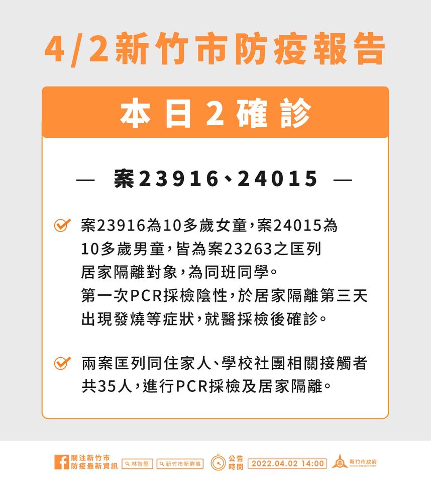 中央流行疫情指揮中心今公布新竹市新增2名確診個案,為案23916(女)與案24015(男)。新竹市衛生局吳欣席局長說明,2案均為日前公布案23263(關東國小學生)的匡列接觸者,2案第一次PCR採檢陰性,居家隔離第3天出現發燒等症狀,就醫採檢後確診,2案共匡列5名同住家人與關東國小同社團30人進行PCR採檢及居家隔離。