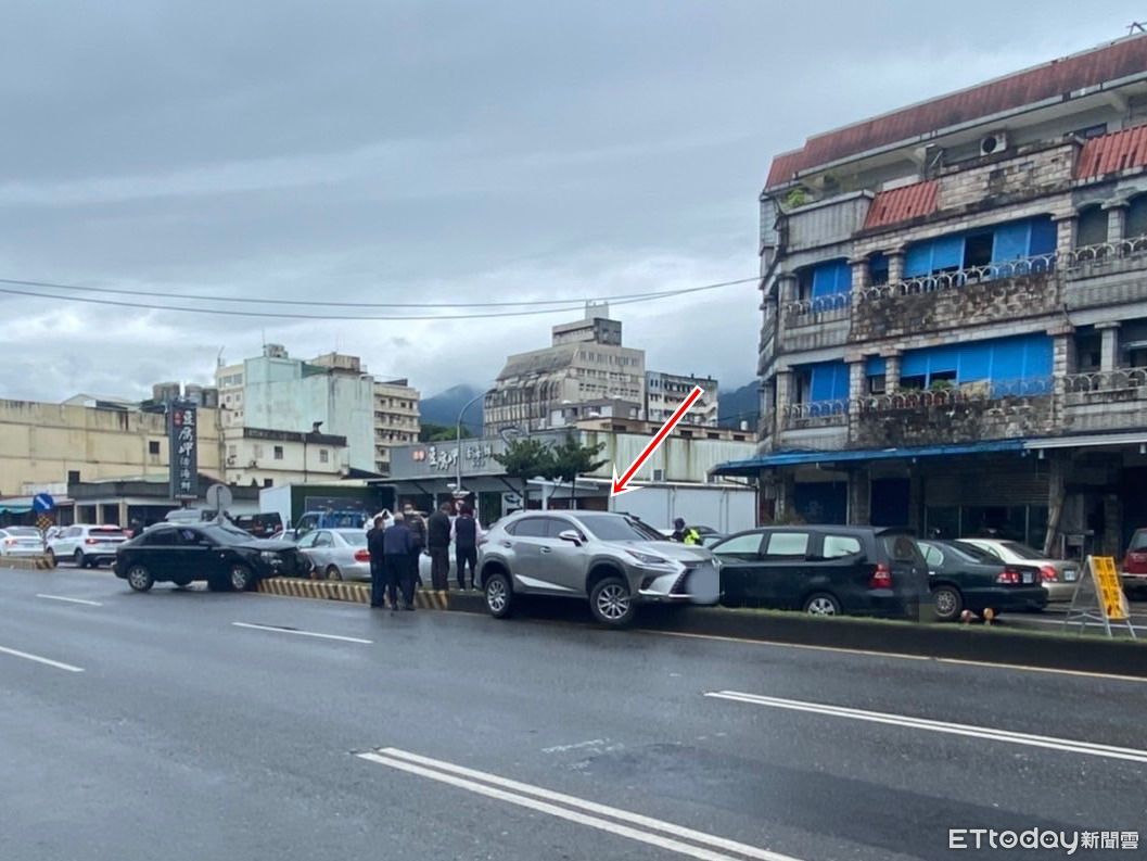 ▲宜蘭蘭陽隧道南口2日下午,銀色休旅車(箭頭所指)直行時遭左轉黑色自小客車擦撞,2車撞上分隔島,波及停等紅綠燈3車。(圖/記者游芳男翻攝,下同)