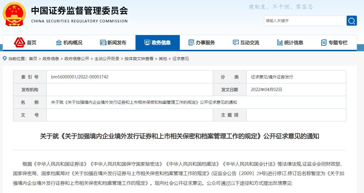 中國證券監督管理委員會2日宣布,與財政部、國家保密局、國家檔案局對「關於加強在境外發行證券與上市相關保密和檔案管理工作的規定」進行修訂,對外公開徵求意見。