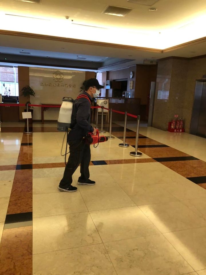 ▲國民黨立委廖國棟國會助理確診,立法院依循可能足跡進行消毒。(圖/取自游錫堃臉書)