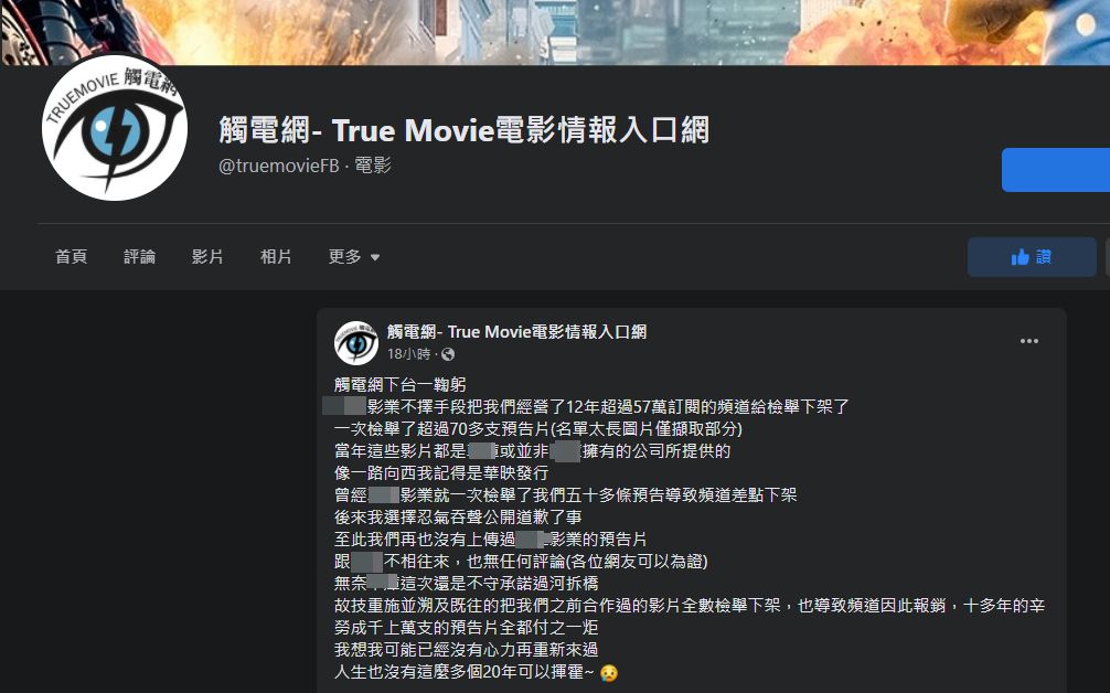 「觸電網下台一鞠躬」,觸電網4日透過臉書發文表示,某影業透過檢舉70支預告片的方式,將他們經營12年、累積57萬訂閱的頻道下架,且被檢舉的影片中有某影業當初提供的影片及其他公司提供的預告片。