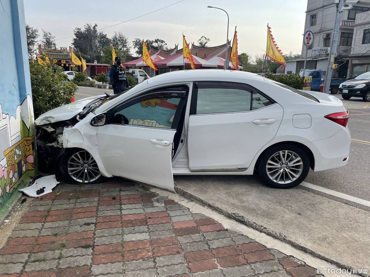 ▼金寧鄉盤山村公所旁十字路口兩車相撞,黑車失控衝上人行道花台,白車也撞上一旁住宅(圖/林名揚翻攝)
