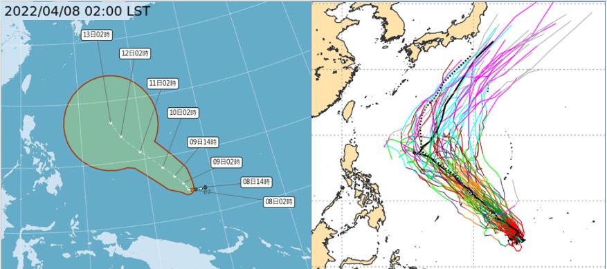中央氣象局「路徑潛勢預測圖」顯示,其5天的潛勢預測路徑與最新(7日20時)歐洲(ECMWF)系集模式,所模擬的路徑(右圖)大致類似,先往西北前進。5天之後系集模擬顯示,將減速、再受到「西風帶」的導引,轉向偏東,呈現大迴轉的特徵。因4月台灣鄰近地區常受中高層「西風帶」盤據,宛如「金鐘罩」,大幅降低「4月颱」靠近台灣的機率;但是否會對台灣天氣帶來間接的影響?則與其接近的程度相關,這才是該觀察的重點。