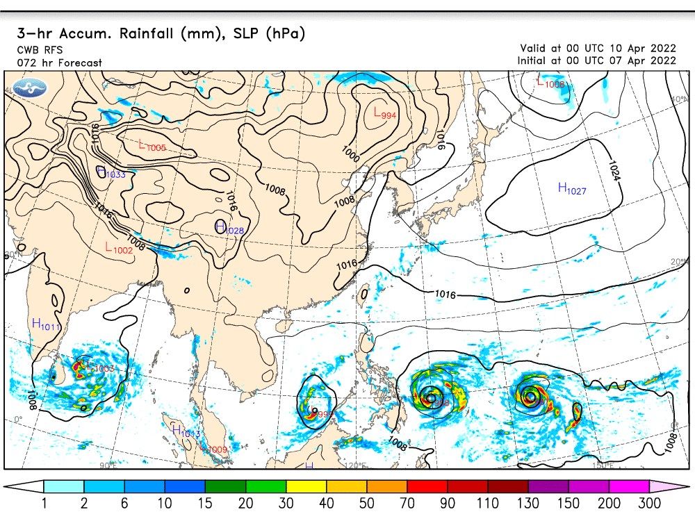 氣象局則表示,現在南方海域非常熱鬧,還有許多熱帶擾動消長中,但各家預報分歧很大,例如美軍預報可能有3個颱風,歐洲模式則是預測只有雙颱發展,若真的有3颱陸續生成,將分別被命名為馬勒卡、梅姬、芙蓉,最快從明日(8日)開始到週末,不排除會形成「3颱共舞」的局面,不過目前預報誤差仍大,還需要進一步觀察。