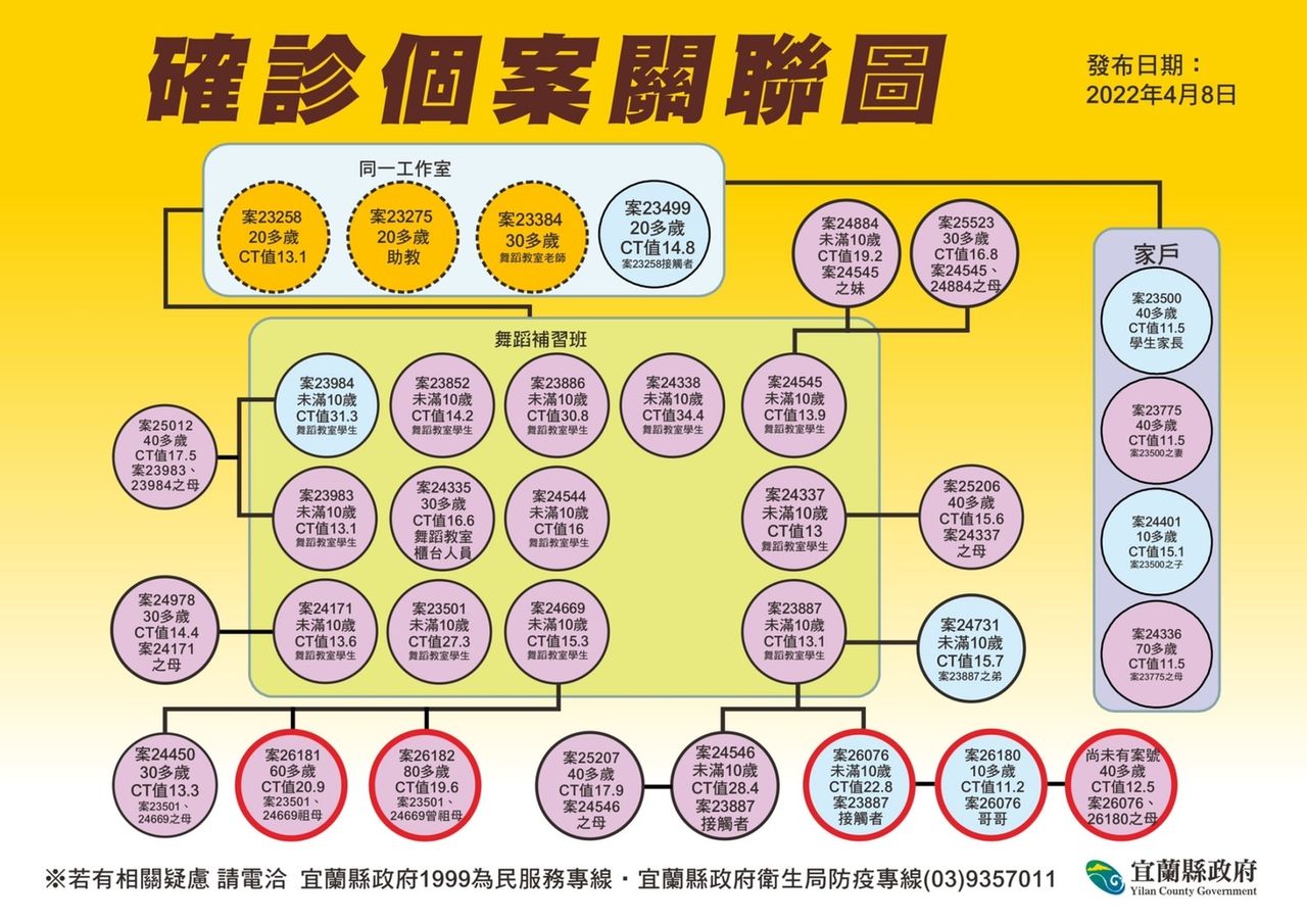 宜蘭衛生局表示,宜蘭今(8)日公布6個案,中央公布5名,另增列1名尚未列案號的確診個案。而6案中的5案(其中1案尚未列案號)與舞蹈教室有關,分別說明如下: