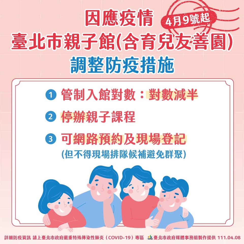 針對台北市今起將調整北市12區親子館及育兒友善園防疫規定,台北市府社會局長周榆修昨日說明,在兼顧防疫及服務下調整防疫措施,親子館及育兒友善園將管制親子入館對數,採原入館對數減半數,並停館內親子課程、講座等相關活動;入館採網路預約及現場登記,不提供現場排隊候補入館,避免群聚。
