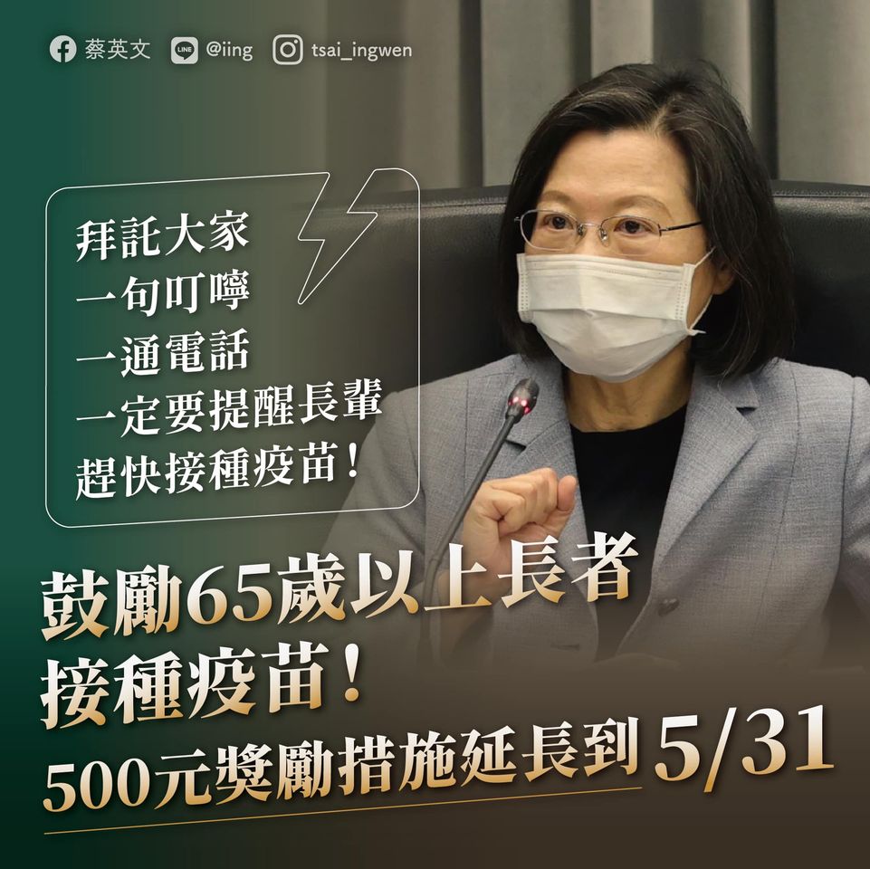 蔡英文表示,她最掛心、也最擔心的,還是長輩的疫苗覆蓋率,國內外的研究都指出,長者是染疫風險最高的一群人。今天,指揮中心已經宣布,鼓勵65歲以上長者接種疫苗的500元獎勵措施,將延長到5月31日。