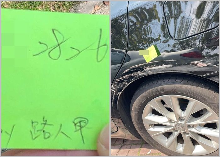 一名女網友發文表示,自己在國道3號東山休息站上廁所回來,發現車子被人擦撞,卻不見肇事者蹤影,幸好一張熱心人士留下的小紙條,上面寫著「xxx-2826撞的」。文章貼出後,網友大軍更調出該車車籍資料「助攻」,讓她相當感動。