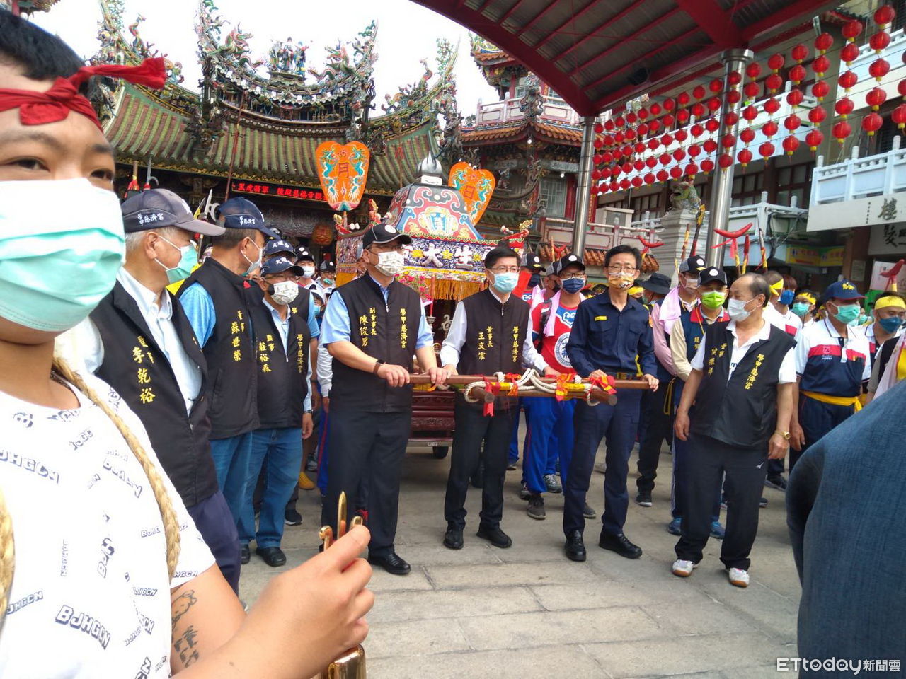 ▲「南瀛5大香-學甲香」祭典,八仙藝閣小朋友戴上防護面罩防疫,學甲慈濟宮印製大批宣導臂章,宣導防疫措施做得好。(圖/記者林悅翻攝,下同)