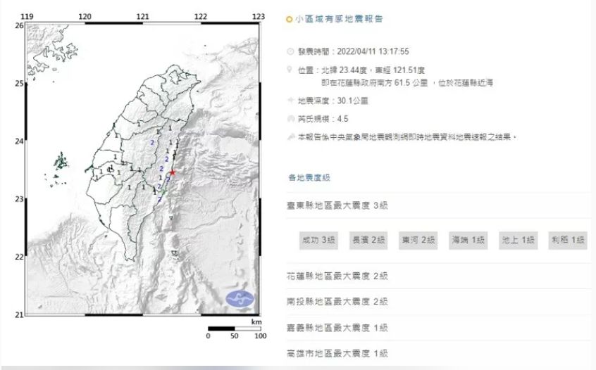 文/中央社根據中央氣象局最新資訊,今天中午1時17分發生芮氏規模4.5地震,地震深度30.1公里,震央位於花蓮縣政府南方61.5公里(位於花蓮縣近海),最大震度台東縣3級。