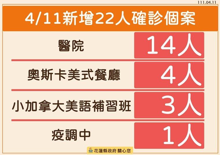 花蓮今(11)日再增22人確診,累計達130例,123人住院中。花蓮縣政府在疫情記者會上表示,今日22例除最後1例疫調中,其餘都是奧斯卡後續衍生,當中有14例為慈濟醫院擴散、4例為奧斯卡美式餐廳延伸,另外小加拿大美語補習班有1名外師曾到過奧斯卡餐廳,傳染給2名小學生、1名家長,共3人染疫,老師尚無案號,1名為昨天深夜酒駕男子,還在疫調當中。