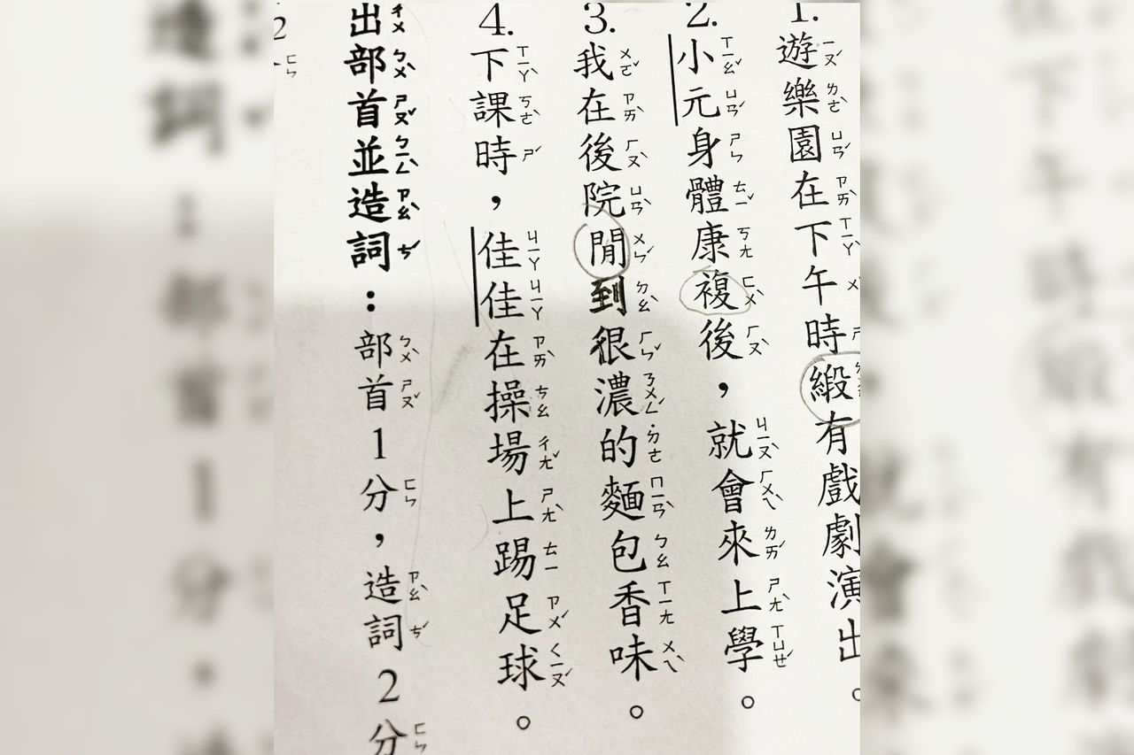 這名媽媽12日上「爆廢公社公開版」發文求解,問到兒子的國文作業改錯字,每題2分共8分的題目,前三題母子都已經輕鬆完成,分別是「時『緞』」應為段、「康『複』」應為「復」,「『閒』到很濃的」應為「聞」,但到了第四題「下課時,佳佳在操場上踢足球。」要從14個字中抓出錯字,結果她看到快脫窗還是找不到,大嘆簡直是眼力大考驗,「為了這題,我活那麼大第一次認真讀書,讀我兒子的課本,目前眼睛輝煞煞…」