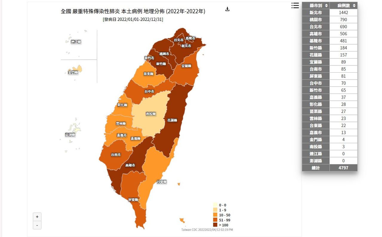 本土確診衝破5字頭!指揮中心今(12)日公布國內新增551例本土病例,再創今年新高紀錄,統計今年已有4,797人染疫。根據疾管署最新確診地圖顯示,新北市確診已突破千例,而花蓮確診人數也突破百人,顏色深了一階,從原本的橘紅色轉變為咖啡色。