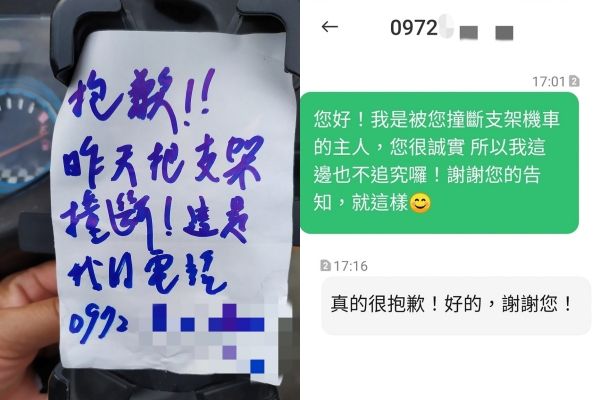原PO在臉書「爆廢公社」的文章中提到,11日早上準備帶孩子去上學時,看到機車夾著一張紙條,上面寫著「抱歉!昨天把支架撞斷!這是我的電話0972XXXXXX」,原本想說算了,畢竟對方已經誠實認錯,她也不打算有其他動作。