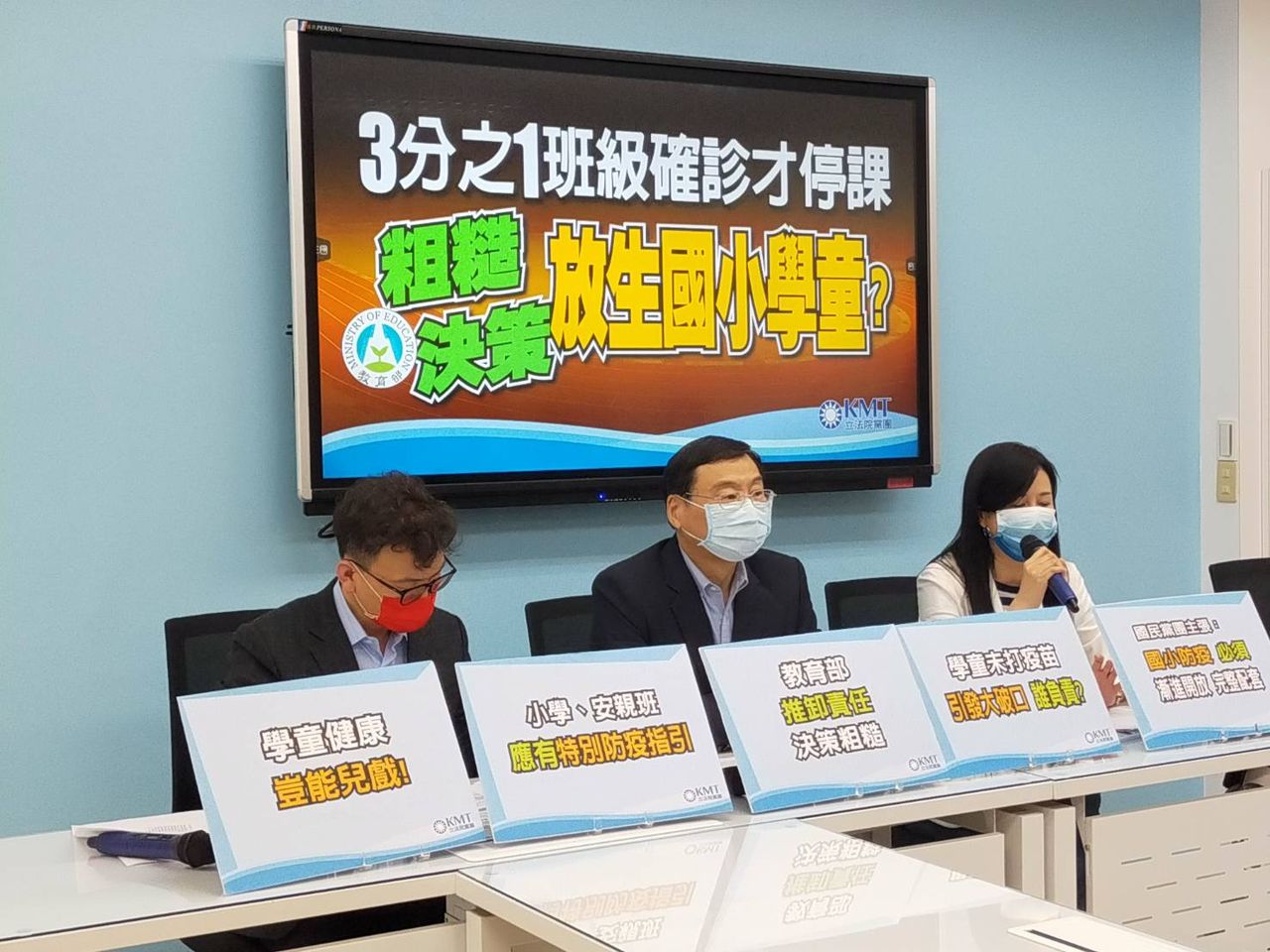 不過,對於停課標準新制,國民黨立法院黨團今天上午舉行「3分之1班級確診才停課,粗糙決策,放生國小學童?」記者會。