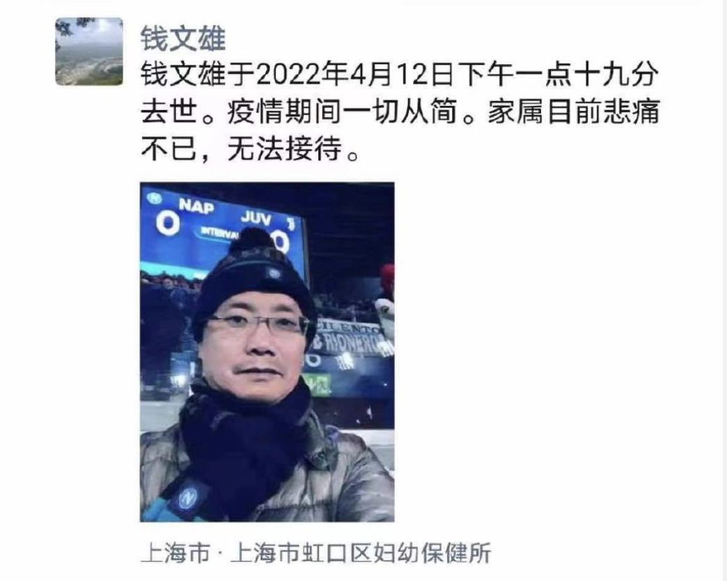 上海本輪疫情亂象不斷,當地基層工作人員承受巨大壓力。網傳上海虹口區衛健委信息中心主任錢文雄12日下午在辦公室尋短,家屬通過錢文雄微信朋友圈發出訃告。大陸環球時報前總編胡錫進也確證此消息,他表示,一悲劇顯然加劇了上海防疫讓部分基層人員不堪重負的印象。