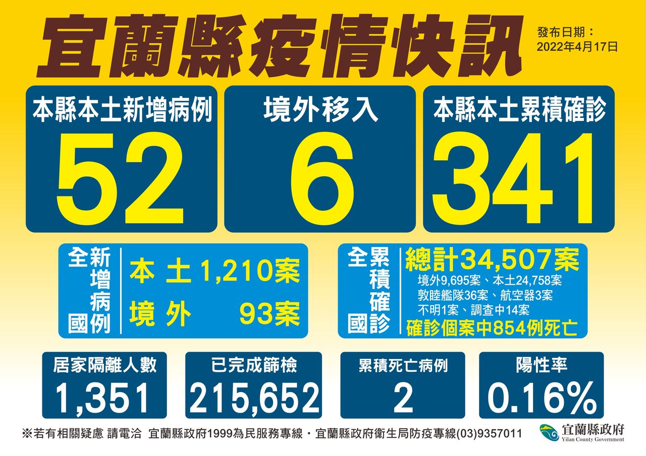 宜蘭染疫再創高,繼14日+46後,17日再增52例,新增52個案中,主要是晶園會館喜宴案+6,再加上衍生接觸者確診已達9人,與喜宴傳播鏈有闗共56人染疫。另,外縣主辦由宜蘭出發的進香團中,13名宜縣民有2人確診。此外,消防+1,台灣菸酒宜蘭營業所+1;參加喜宴員警已3人確診,17日並未增加員警染疫。