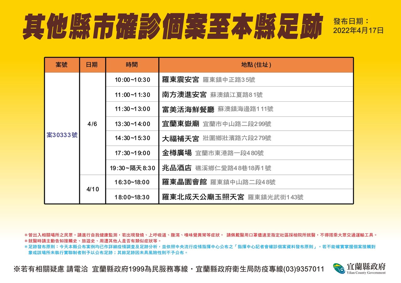 衛生局也在17日公布進香團中外縣市案30333號的宜蘭足跡如下: