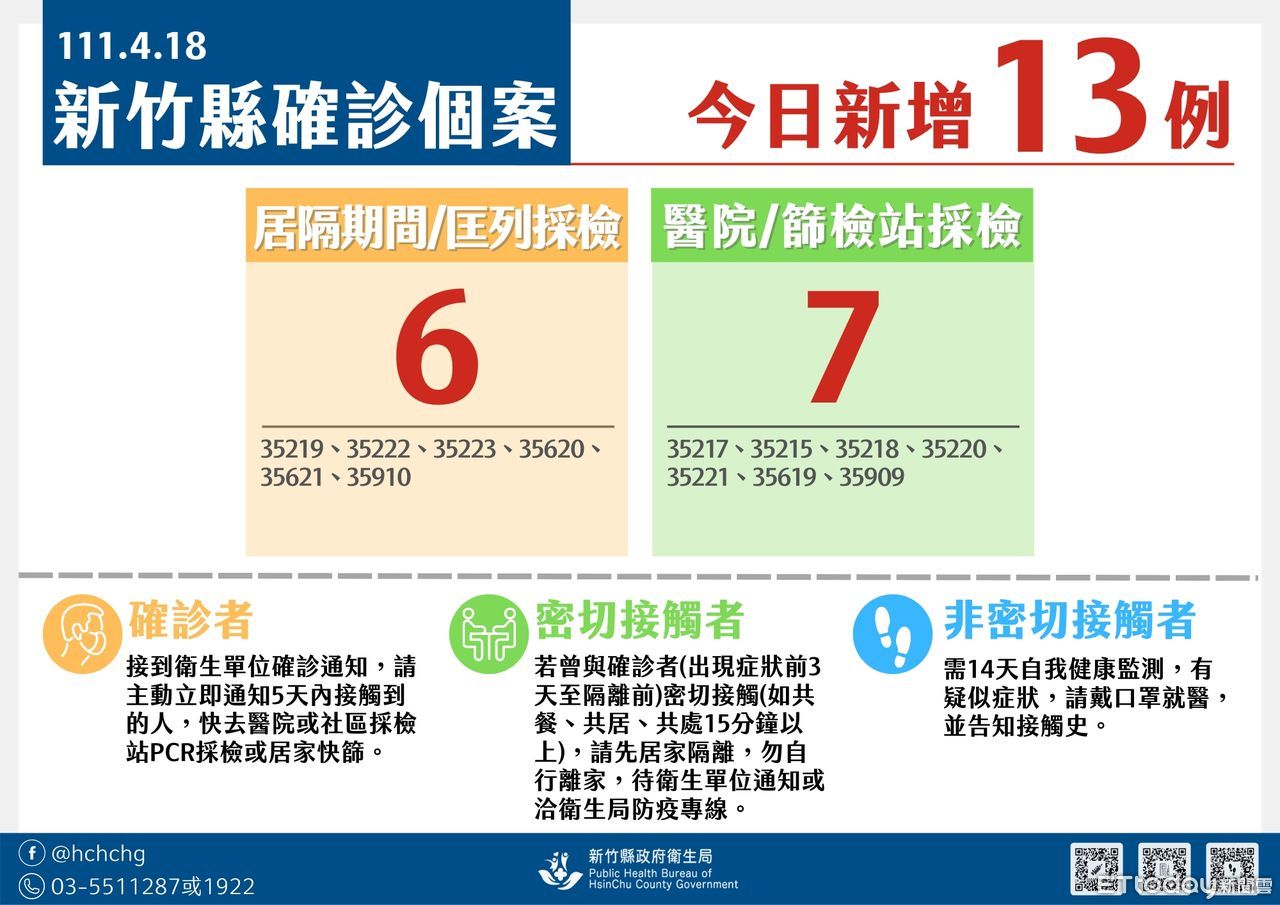 竹縣衛生局表示,新增13例為3位男性、10位女性,年齡分布於6-40歲,Ct值在13.0-34.01之間,症狀以喉嚨痛、咳嗽、發燒為主,分布地區為竹北市9例、新豐鄉4例,目前均安排收治醫院或集中檢疫所治療。