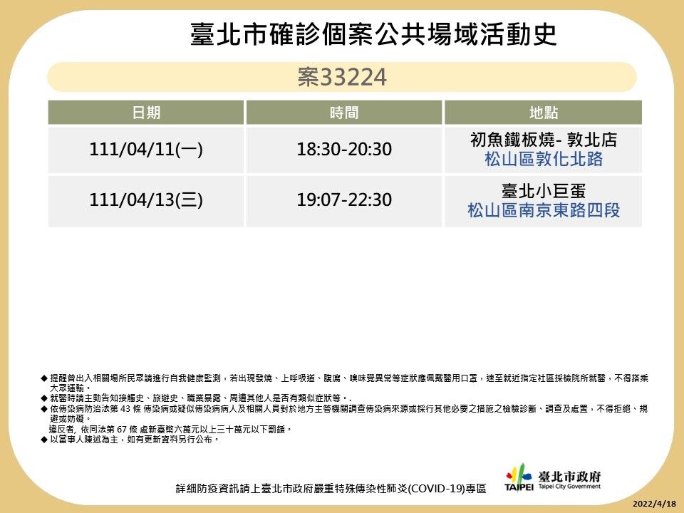 全台18日新增1390例本土確診個案,其中台北市270例,分別居住於中山區47例、大安區27例、士林區26例、文山區、信義區及萬華區各25例、內湖區21例、北投區17例、松山區16例、大同區及中正區各14例、南港區13例。台北市衛生局18日公布14張確診足跡,包括健身工廠長春店、唐吉訶德忠孝新生店、瓦城泰國料理美麗華店、13日台北小巨蛋張惠妹演唱會、美福飯店、星巴克、阜杭豆漿等。